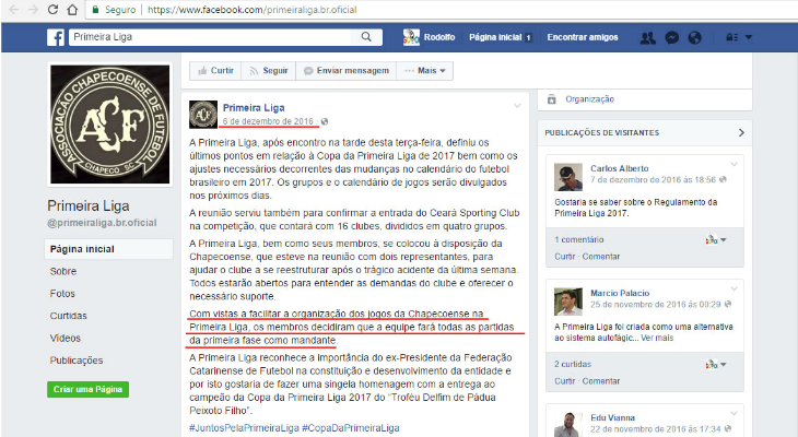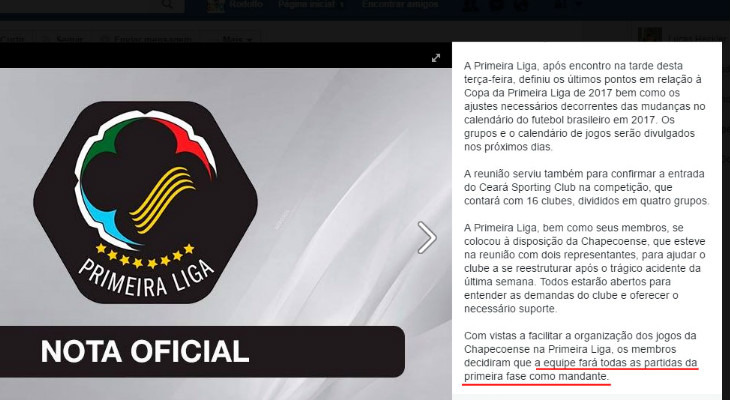Em 6 de dezembro de 2016, a Primeira Liga - através do site oficial e de suas redes sociais - divulgou que "A Primeira Liga, bem como seus membros, se colocou à disposição da Chapecoense, que esteve na reunião com dois representantes, para ajudar o clube a se reestruturar após o trágico acidente da última semana. Todos estarão abertos para entender as demandas do clube e oferecer o necessário suporte. Com vistas a facilitar a organização dos jogos da Chapecoense na Primeira Liga, os membros decidiram que a equipe fará todas as partidas da primeira fase como mandante".