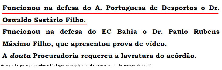Para Márcio Cruz, a alegação da Portuguesa de que não foi avisada da punição cai por terra pelo fato de que o advogado Oswaldo Sestário Filho esteve no julgamento.