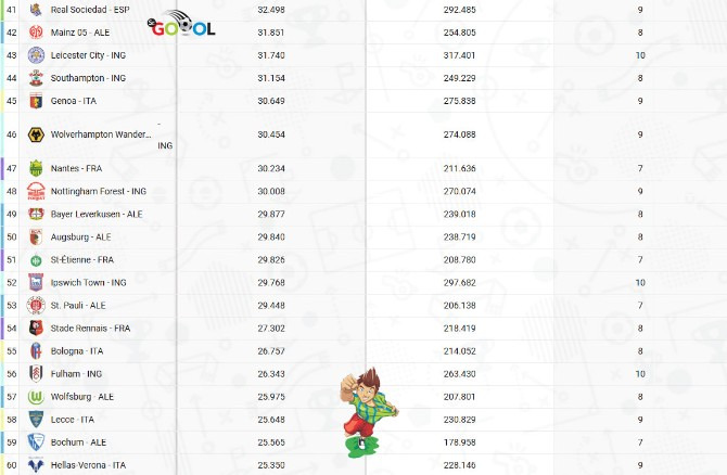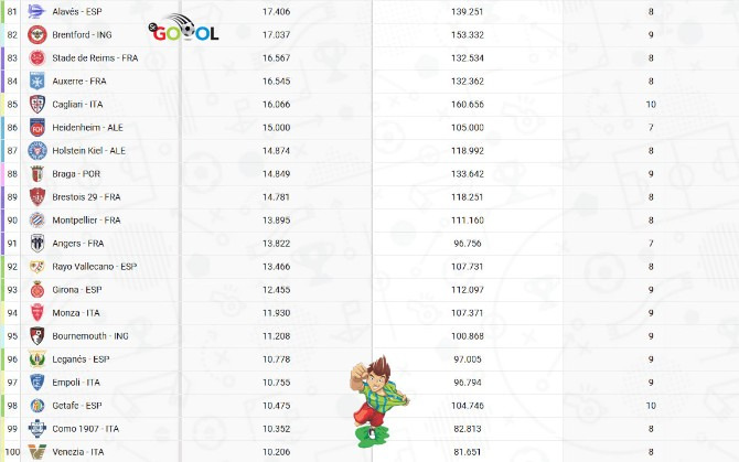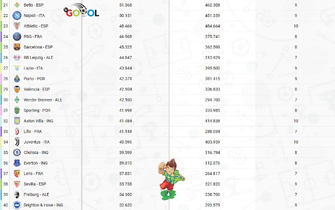 O Borussia Dortmund não tem se dado bem em campo, mas ainda assim, sua torcida não decepciona. O BVB lidera o ranking com 114 clubes da Bundesliga, La Liga, Lega Serie A, Ligue 1, Premier League e Primeira Liga, com média de 81.365 torcedores. Em oito jogos como mandante, a muralha preta e amarela já arrastou mais de meio milhão de fãs (650.920).