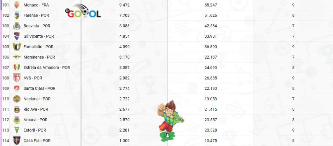 Leia a notícia completaAs últimas 13 colocações são de clubes portugueses. A lanterna geral é do Casa Pia com média de 1.309 testemunhas. Além dos 13 clubes, apenas o Monaco não chega a dez mil espectadores.