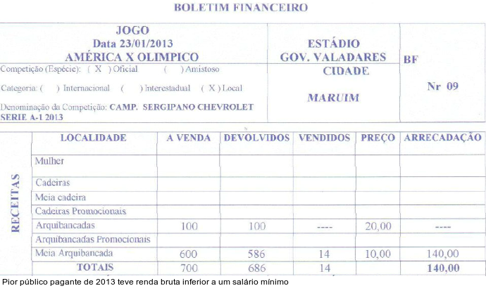 Sergipe - A Federação Sergipana de Futebol (FSF) estava em falta com os borderôs e súmulas do Estadual 2013. Mas a entidade colocou tudo em ordem no final desta semana e revelou o pior público do futebol brasileiro na temporada. O América está de volta à liderança. Foi o próprio clube sergipano que começou esta disputa ao encorajar 25 pagantes na segunda rodada. (Veja o borderô ao final da matéria!)