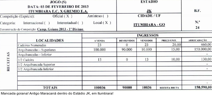 No documento, o total de ingressos à venda foi de 100.036, sendo 23 de cadeiras numeradas, 13 de meia-entrada e 100 mil para as arquibancadas superiores. Lógico que houve equívoco na digitação do borderô. O Estádio JK tem capacidade para "apenas" 15 mil torcedores. (Veja o borderô no final do texto!)
