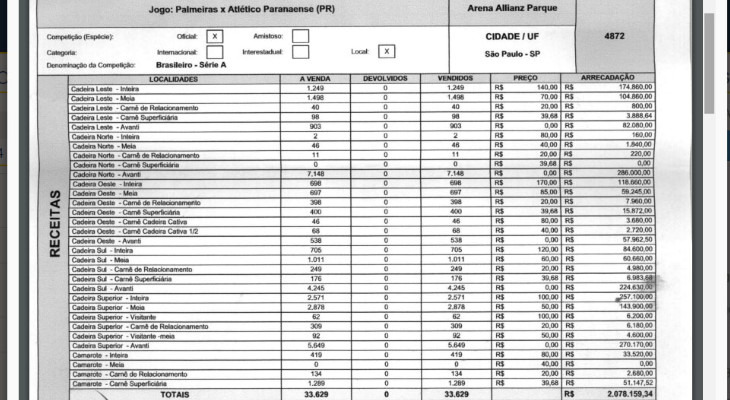 O Palmeiras estreou no Brasileirão contra o Atlético Paranaense diante de 33.629 pagantes e renda bruta de R$ 2.078.159,34. Nesta partida, o Verdão teve gastos de R$ 554.462,16. A renda líquida acabou sendo de R$ 1.523.697,18. Na estreia contra o Grêmio, o Corinthians levou público levemente inferior ao rival, mas mesmo assim gastou mais.