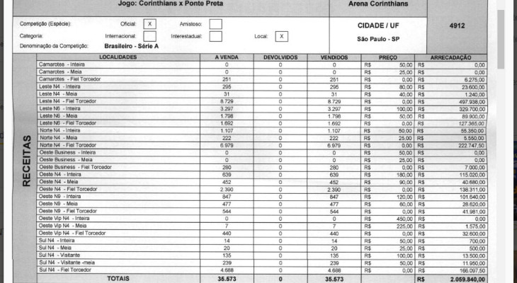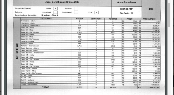 Na abertura do Brasileirão na Arena Corinthians, os donos da casa atraíram público de 31.533 pagantes e alcançaram renda bruta de R$ 1.627.511,00 (os valores dos ingressos dos rivais são bem parecidos). As despesas alvinegras, contudo, saltaram para R$ 647.323,75, o que derrubou a renda líquida para "só" R$ 980.187,25.