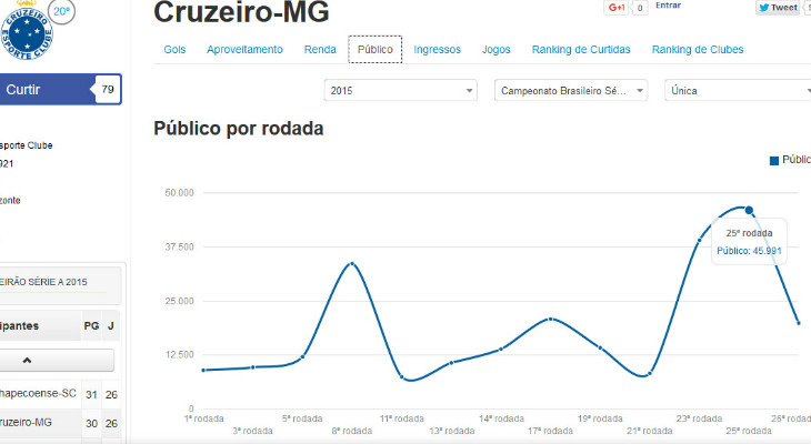 Leia a notícia completaO Cruzeiro, por sua vez, levou 45.991 pagantes ao Mineirão na 25ª rodada. Este foi o maior público da Raposa na Série A. Mas no duelo seguinte como mandante, o Cruzeiro foi deixado de lado pelos torcedores e apenas 19.888 gatos pingados estiveram no maior estádio de Minas Gerais. (Clique aqui e confira o gráfico completo de público do Cruzeiro!)