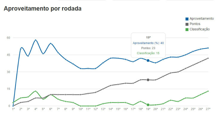 Entre a 20ª e a 27ª rodada, o clube catarinense obteve seis vitórias (três em casa e três fora), um empate como visitante e uma derrota ao lado da torcida, além de 12 gols a favor e seis contra. Aproveitamento de 79,2%. O Bahia, como comparação, ocupa a vice-liderança do returno, mas tem "apenas" 15 pontos. Líder no geral, o Vasco só anotou 12 pontos no 2º turno.Clube paulista já acumula 22 gols de saldo, enquanto mineiro fizeram só 19 gols no Brasileirão