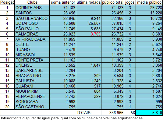 No geral, o Paulistão ostenta média de 5.810 pagantes. Em 58 jogos - o São Paulo ainda realizará duas partidas -, o total é de 336.966. A lanterna é do São Caetano com média de 755 pagantes. Apenas o Azulão e o Atlético Sorocaba (999) estão abaixo de mil pagantes.