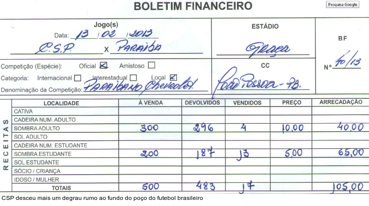 Na última quarta-feira, o Sr. Goool apresentou o então pior público do Brasil com apenas 18 pagantes no Campeonato Capixaba. Mas o CSP desceu outro degrau e levou 17 pagantes ao empate sem gols contra o Paraíba pela décima rodada, no Estádio da Graça, em João Pessoa. Tinha mais gente em campo, com os 22 jogadores e o trio de arbitragem, do que nas arquibancadas. Agora, esse é o pior público do futebol verde amarelo em 2013. (Veja o borderô ao final da matéria!)