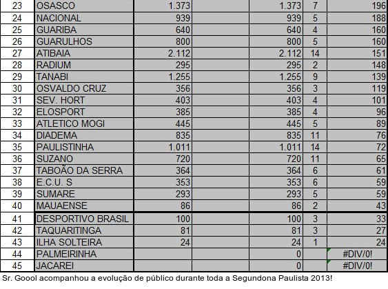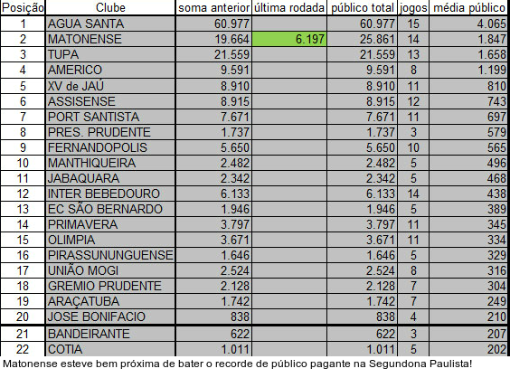 Leia a notícia completaO Cotia, por sua vez, até completou a lista dos acessos, mas amargou a modesta 22ª colocação com média de só 202 pagantes. No geral, a Segundona Paulista teve média de 626 torcedores. Em 311 jogos com a presença de torcida, o público total foi de 194.623 pagantes.