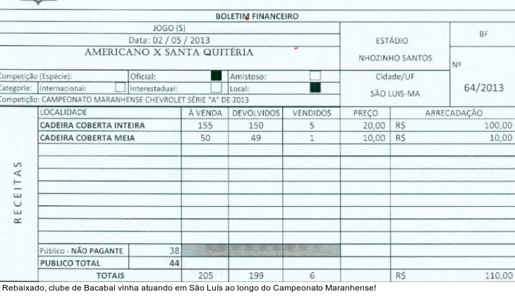 Leia a notícia completaA partida, porém, contou com 44 torcedores. Ao todo 38, ou seis vezes mais do que os pagantes, entraram sem pagar. Foram colocados à venda 205 entradas. A Federação Maranhense de Futebol (FMF) embolsou a fortuna de R$ 5,50. Já a ambulância saiu por R$ 700, enquanto a água mineral para os policias custou R$ 110. Com tantas despesas, o Americano amargou déficit de R$ - 2.244,65.