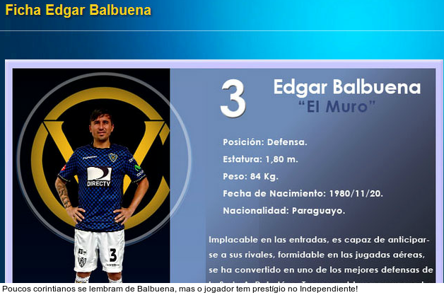 No Independiente desde 2011, Balbuena atua com a camisa de número 3 e ganhou o apelido de "El Muro". A primeira missão do jogador de 32 anos e de seus companheiros na Copa Sul-americana será diante do Anzoátegui, da Venezuela. Mas confiança não falta ao Club Social y Deportivo Independiente.