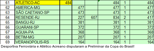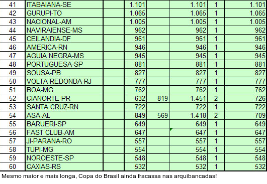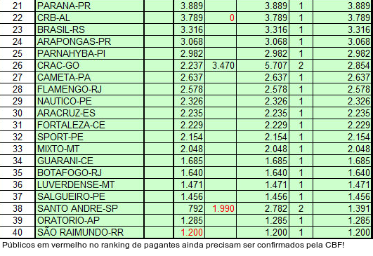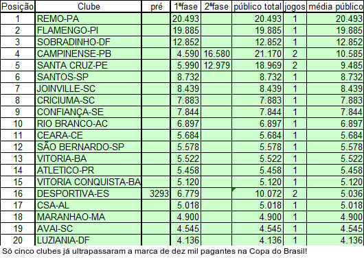 Pior! Dos cinco clubes que superaram a marca de dez mil pagantes, apenas um (Santa Cruz) estará nas disputas das Séries A, B, C ou D do Campeonato Brasileiro. O líder do ranking é o Remo, eliminado pelo Flamengo na Copa do Brasil e sem vaga para a Série D. O clube paraense atuou uma vez como mandante e conseguiu público de 20.493 pagantes.