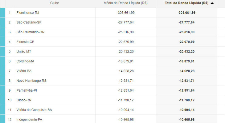 A situação ainda poderia ser pior. Afinal, Madureira e Boavista venderam seus mandos de campo e, com isso, receberam uma renda pré acertada. Caso contrário, a dupla também poderia estar no time dos endividados. O Boavista atuou ante o Internacional em Cascavel e abocanhou R$ 250.000,00. Já o Madureira foi eliminado pelo São Paulo em Londrina, mas embolsou R$ 120.000,00. Deixando esses dois clubes de lado, a melhor renda seria do CSA, único a colocar mais de dez mil torcedores nas arquibancadas (14.206). O duelo no Rei Pelé, em Maceió, gerou receita de R$ 85.398,28.O Fluminense, em compensação, foi um dos clubes do Brasileirão que atuou como mandante, mas colheu déficit. O rombo tricolor chegou a R$ - 303.661,99. Na goleada sobre o Salgueiro, o Flu foi visto por apenas 2.560 torcedores. A dívida do Fluminense é tão assustadora que o déficit do vice-lanterna parece "dinheiro de pinga". O São Caetano foi eliminado em casa e ainda amargou renda negativa de R$ - 27.777,64. São Raimundo-RR (R$ - 25.316,90), Floresta-CE (R$ - 22.670,99) e União-MT (R$ - 20.432,20) foram outros mandantes com déficits superiores a R$ 20 mil.