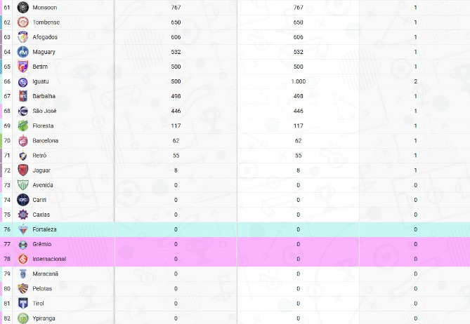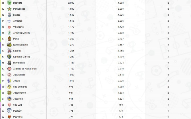 Entre os Estaduais, a melhor média disparada é do Paulistão (11.381). O Pernambucano ocupa a vice-liderança (5.829), pouco acima do Cariocão (5.381). O ranking dos Estaduais com clubes do Brasileirão segue com Baianão (4.693), Mineiro (4.369), Cearense (3.520) e Gauchão (2.798).