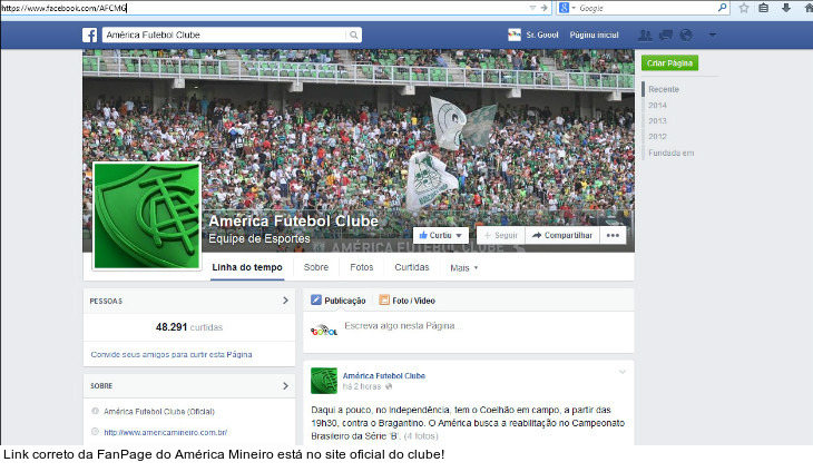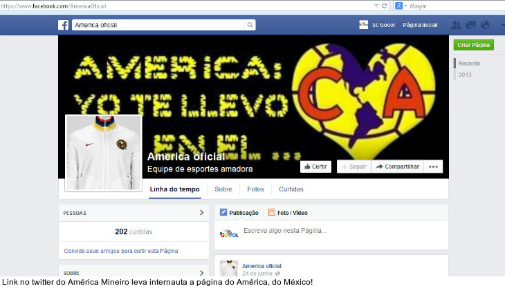 Minas Gerais - As derrotas em campo e nos tribunais desnortearam o América Mineiro e não foi apenas na Série B do Campeonato Brasileiro. Perdido, o Coelho também tem se atrapalhado nos gramados das redes sociais. O Sr. Goool observou que o link para a FanPage do América - divulgado no twitter oficial do clube - está completamente errado.