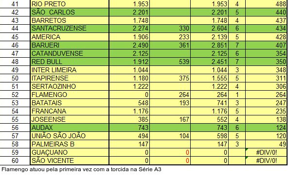 Leia a notícia completaO Top 3 da Série A3 Paulista tem como líder o Votuporanguense, com média de 1.676 pagantes. A segunda colocação segue com o Marília (1.435) e o terceiro lugar é do Novorizontino (1.411). No geral, em 287 partidas, as Séries A1, A2 e A3 têm média de 2.531 pagantes.