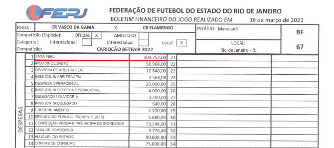 Assim como todas as outras entidades, a FERJ cobra uma taxa em cima da renda bruta dos mandantes a cada partida. Ao contrário das outras Federações, porém, a FERJ exige valor acima dos 'costumeiros' 5%. O clássico, com 33.999 pagantes, teve renda bruta de R$ 1.139.360,00.