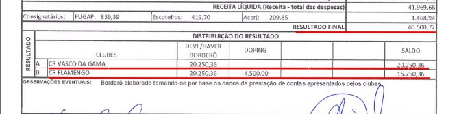 A FERJ, sem entrar em campo, embolsou a bagatela de R$ 104.752,00. Isso equivale a pouco mais de 9% da receita bruta. Se tivesse cobrado os 5%, a entidade carioca teria ganho R$ 56.968,00. Como comparação, a renda líquida do jogo foi de apenas R$ 40.500,72.