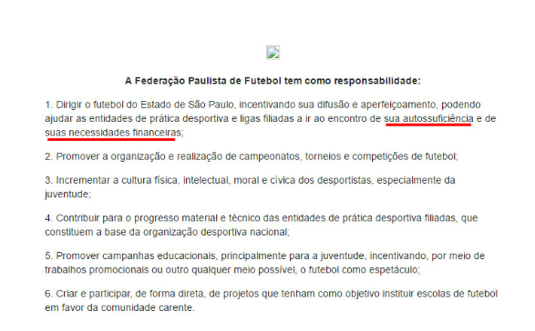 “O percentual de 5% é aplicado diretamente no fomento do futebol paulista, financiando a organização dos campeonatos como o Paulistão A3, Copa Paulista, Segunda Divisão, passando pelas categorias de base e futebol feminino. Ou seja, em competições que ainda não geram receitas. A verba também é utilizada em ações da FPF, como o projeto social Nosso Sonho, material de apoio em jogos e cursos de gestão para os clubes. Um dos maiores investimentos diz respeito ao incentivo para aumento de público nos estádios do interior, por meio do Programa Futebol Sustentável, que permite a troca de garrafas PET por ingressos. O programa é 100% financiado pela federação (em dois anos, já são quase 1 milhão de torcedores a mais nos estádios e 3 milhões de garrafas tiradas das ruas). Nos dois anos de gestão do presidente Reinaldo Carneiro Bastos, a FPF aumentou em 187% a subvenção aos clubes. Saltou de R$ 7,8 milhões em 2014 para R$ 20,9 milhões em 2016.”
