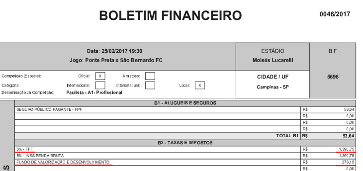 Desta forma, a FPF devorou, em 121 jogos do Campeonato Paulista, nada menos do que R$ 3.241.614,04, segundo levantamento do Sr. Goool. Tal receita deveria estar nos cofres dos clubes, mas acabou nas mãos da Federação. A taxa cobrada em competições da Confederação Brasileira de Futebol (CBF) é de 5%, mas a FPF foi além com o pomposo "Fundo de Valorização e Desenvolvimento do Futebol Paulista".