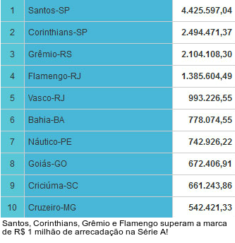 Já Santos, Corinthians, Grêmio e Flamengo estão rindo à toa. O quarteto acumula superávit de mais de R$ 1 milhão. Só na estreia do Brasileirão, o Santos - recordista no quesito - embolsou R$ 4.321.386,59. O montante do Peixe chega a R$ 4.425,597,04.