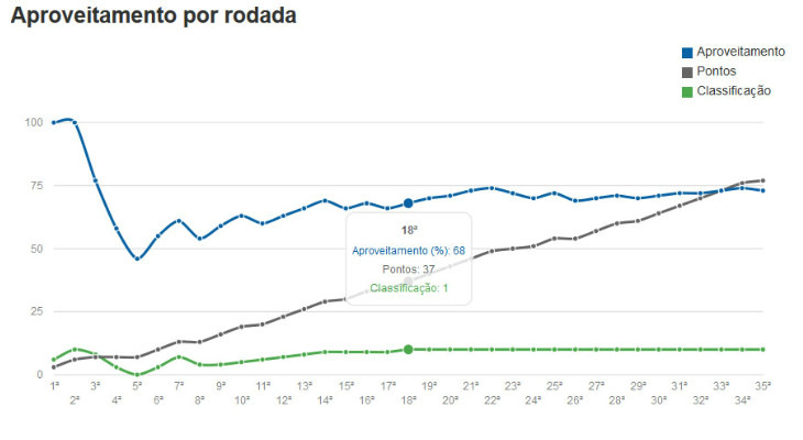 Sem falar que o aproveitamento do Corinthians (73,3%) é o maior da história dos pontos corridos. O time de Cássio, Gil, Elias, Jadson, Renato Augusto e cia. ostenta, após 35 rodadas, 23 vitórias (15 em casa e oito fora), oito empates (um como mandante e sete como visitante) e quatro derrotas (uma diante da torcida e três fora). O Corinthians ainda apresenta a melhor campanha como mandante (90,2%) e a melhor campanha como visitante (57,4%).