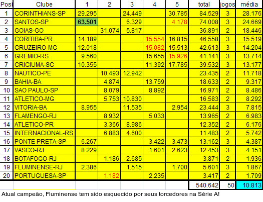 Apenas os oito primeiros colocados ostentam média acima de dez mil pagantes. O Corinthians lidera o ranking (28.176), seguido por Santos (24.669) e Goiás (18.446). Em 50 partidas, o Brasileirão ostenta média de 10.813 pagantes e total de 540.642.