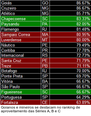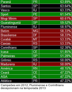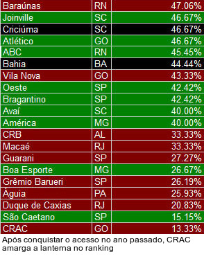 O Fluminense, atual campeão do Brasileirão, amarga a 27ª posição, com aproveitamento de 58,97%. O Corinthians, atual campeão da Libertadores e do Mundial de Clubes, faz pior, no 32º lugar (52,38%). A lanterna, porém, é do CRAC. O clube goiano, que subiu na temporada passada para a Série C, ostenta aproveitamento de 13,33%.