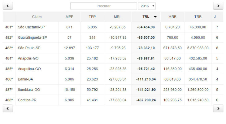 Nas últimas dez colocações há ainda mais clubes das Séries A, B e C. O São Paulo, por exemplo, está R$ - 78.362,10 no vermelho. Garantido na Série C, o Guaratinguetá amarga dívida de R$ - 65.507,00. De volta à Série B, o Londrina pagou R$ 59.233,04 para entrar em campo durante o Estadual Paranaense.