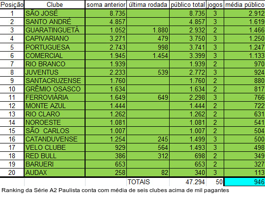 No geral, a Série A2 tem média de 946 pagantes. Em 50 partidas, o total de público é de 47.294. Na lanterna, o Audax aparece com 113 pagantes. Na última rodada, o clube da capital levou apenas 82 torcedores ao estádio. O Grêmio Barueri aparece com média de 327, contra 349 pagantes do Red Bull.