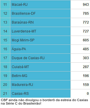 A Série C, até aqui, apresenta média de 3.214 pagantes e público total de 64.278. A Confederação Brasileira de Futebol (CBF) ainda não divulgou o borderô da estreia do Caxias que aparece sem público no ranking.