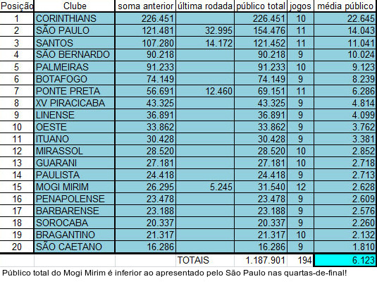 O Santos, por sua vez, conseguiu o segundo maior público das quartas-de-final. No clássico diante do Palmeiras, o Peixe recebeu 14.172 pagantes na Vila Belmiro. O Santos está na terceira posição do ranking (11.041). Já no duelo de alvinegros, a Ponte Preta foi goleada pelo Corinthians (4 a 0) sob os olhares de 12.460.