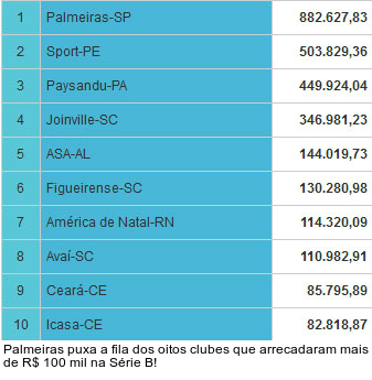 Leia a notícia completaOs números de Paysandu e Joinville também são animadores. A dupla aproveita os estádios cheios para faturar. O Papão acumula R$ 449.924,04 de renda líquida. O JEC, por sua vez, aparece com R$ 346.981,23. Ao todo, oito clubes superam a marca de R$ 100 mil de arrecadação.