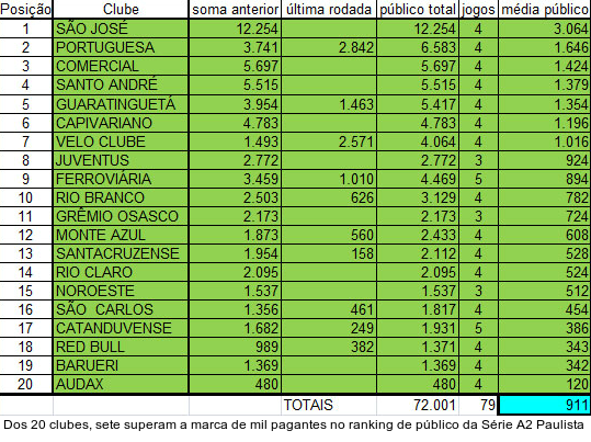 Antes do Velo há ainda Guaratinguetá, na quinta posição, com média de 1.354 pagantes, e Capivariano, com média de 1.196. O Guará foi outro clube a conquistar bom público na oitava rodada (1.463). Mas no geral, a média da Série A2 ainda deixa a desejar.