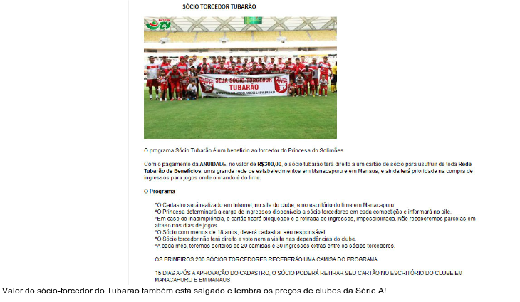 Mas não é só nos ingressos que a diretoria do Princesa do Solimões crê que o clube é da elite. O programa de sócio-torcedor do Tubarão também está salgado. Os interessados desembolsam R$ 300 por ano. O torcedor terá direito a apenas "um cartão de sócio para usufruir de toda Rede Tubarão de Benefícios, uma grande rede de estabelecimentos em Manacapuru e em Manaus, e ainda terá prioridade na compra de ingressos para jogos onde o mando é do time".
