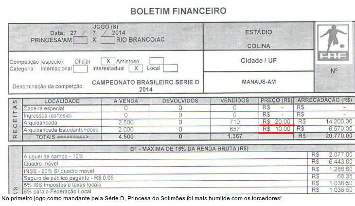 Amazonas - O Princesa do Solimões disputa a Série D do Campeonato Brasileiro, mas os torcedores pagam ingressos e o programa de sócio como se vestissem a camisa de um clube da Série A. Na última quarta-feira, a diretoria do clube amazonense anunciou que os ingressos subiriam para R$ 30, sendo a meia-entrada R$ 15. No único jogo em que realizou como mandante na Série D, a entrada custou R$ 20 e a meia R$ 10.