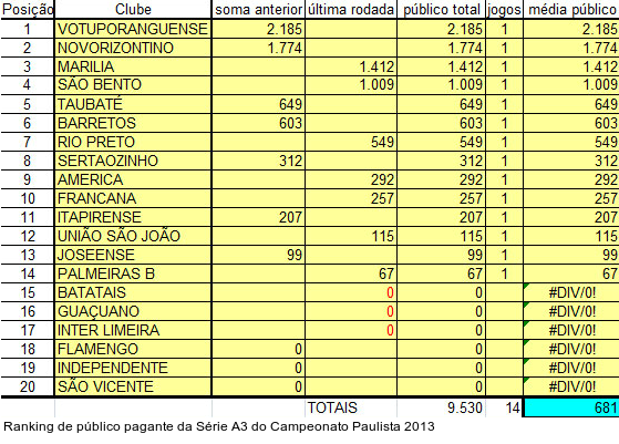 São Paulo - Das 20 partidas disputadas na Série A3 do Campeonato Paulista, seis tiveram os portões fechados por falta de laudos exigidos pela Federação Paulista de Futebol (FPF). Flamengo, Independente, São Vicente, Batatais, Guaçuano e Inter de Limeira ainda não puderam jogar ao lado de seus torcedores. Como a ferramenta de ranking do Sr. Goool ficará pronta nos próximos dias, esta primeira versão é nos moldes antigos.