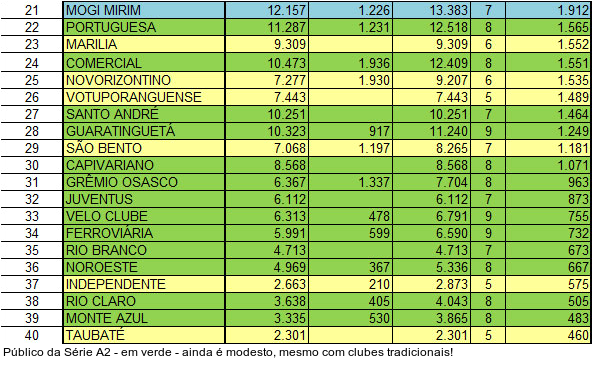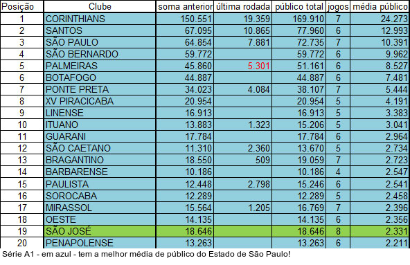 A rodada do final de semana quase não mexeu no ranking de público. O Corinthians (24.273) segue na liderança, seguido por Santos (12.993) e São Paulo (10.391). O Top 3 da Série A2 conta com São José (2.331), Portuguesa (1.565) e Comercial (1.551). Marília (1.552) - que assumiu a liderança da Série A3 -, Novorizontino (1.535) e Votuporanguense (1.489) são os três melhor clubes da terceira divisão estadual.