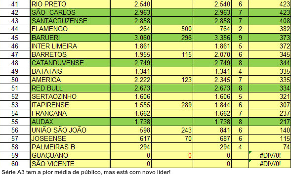 Leia a notícia completaA pior situação é da Série A3 que sofreu com os portões fechados. Ao todo 22 jogos não contaram com a presença do torcedor. A Série A3 ostenta média de 584 pagantes. Em 98 partidas, o total de público é de 57.253. Juntando as três divisões, a média é de 2.409 pagantes e total de 905.765.