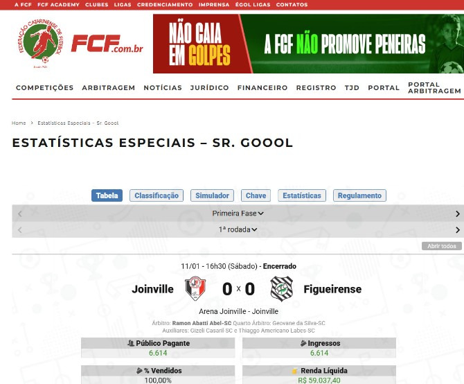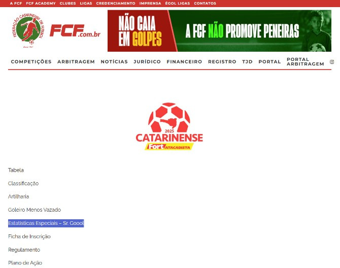 Santa Catarina - O conteúdo diferenciado do Sr. Goool já está disponível no site da Federação Catarinense de Futebol (FCF). Ao longo da edição 2025 do Campeonato Catarinense, o Sr. Goool fornecerá tabela, classificação, estatísticas e simulador à entidade do Sul. Caso clubes e federações queiram contar com o conteúdo do Sr. Goool, entrem em contato. Conheça todas as ferramentas do Sr. Goool!