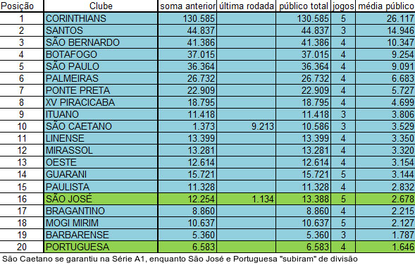 Com essa substancial subida, o São Caetano se "garantiu" na Série A1. Se as três divisões do Estado de São Paulo levassem em conta as médias de público, só Penapolense e Atlético Sorocaba seriam "rebaixados" à Série A2. Novato no Paulistão, o Penapolense tem média de apenas 1.049 pagantes no 28º lugar. Já o Sorocaba, na 31ª posição, ostenta média de 954.