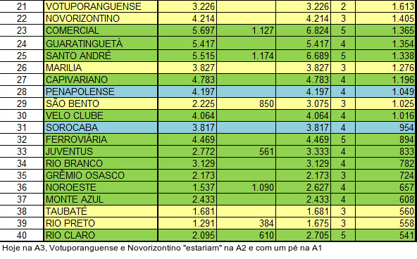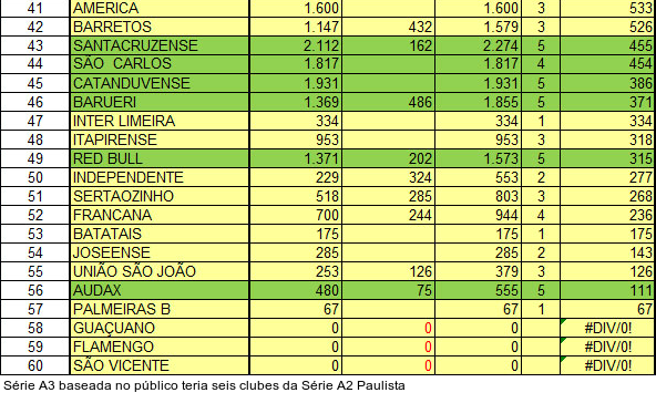 Em compensação, Votuporanguense e Novorizontino - hoje na Série A3 - estariam na Série A2 e com um pé na Série A1. Líder no ranking de público da A3, o CAV tem a 21ª melhor média de público das três divisões com 1.613 pagantes, contra 1.405 do Novorizontino. Marília, São Bento, Taubaté e Rio Preto também "subiriam" de divisão.