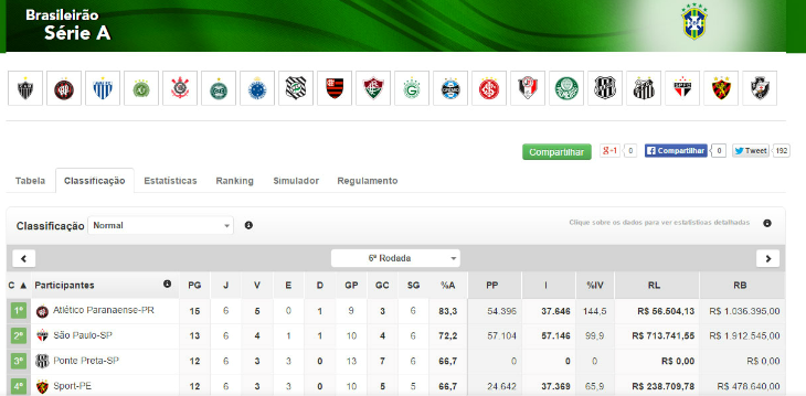 Continuando na página de clubes, o torcedor internauta observará que o espaço - à esquerda - ganhou um box com a classificação. Neste box, o clube selecionado sempre estará em destaque. Caso o clube escolhido esteja no meio da tabela, o box da classificação mostrará aquele pedaço, mas sempre com a possibilidade de subir ou descer as colocações. Por fim, na página de clubes, selecione a aba "aproveitamento" e note que o gráfico ganhou novas linhas de informações sobre a pontuação e a classificação do clube rodada a rodada.