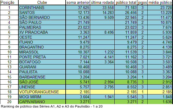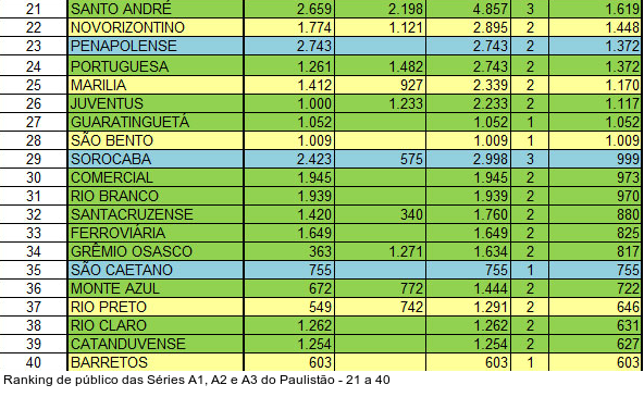 A novidade nesta atualização é a vice-liderança do Santos. O Peixe contou com a presença de 14.283 pagantes no clássico contra o São Paulo e tomou a segunda colocação do São Bernardo. Agora, o Santos ostenta média de 13.228 pagantes, contra 11.473 do São Bernardo. São Paulo (10.875) e Palmeiras (7.674) completam o Top 5.