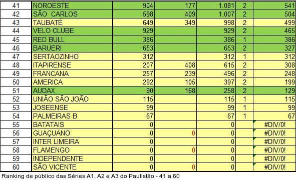 Pelas Séries A2 e A3, São José e Votuporanguense estão na frente de cinco clubes da elite. Melhor clube da Série A2, o São José ocupa a 16ª posição no geral, com média de 2.912 pagantes. O CAV vem logo atrás, no 18º lugar - líder da Série A3 -, com média de 2.185 pagantes.