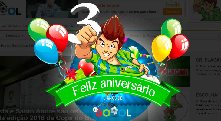 São Paulo - O Sr. Goool está em festa! Nesta quinta-feira, o Sr. Goool completa três anos de fundação. Nada melhor do que apresentar todas as ferramentas e comemorar todas as conquistas do site. Ao longo deste tempo fomos além das tabelas e classificações. Buscamos rankings, simuladores, estatísticas, sistema de busca da arbitragem e tantos outros itens especiais aos torcedores internautas.
