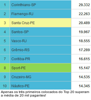 Leia a notícia completaNa segunda colocação, o Flamengo apresenta média de 22.263 pagantes. O clube carioca turbinou sua média levando o duelo contra o Coritiba para o Mané Garrincha, em Brasília. Enquanto isso, o Santa Cruz, mesmo na Série C, ocupa o terceiro lugar com média de 21.014 pagantes.