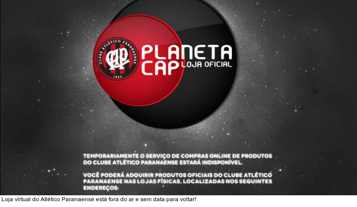 O site oficial do Planeta CAP - loja virtual do Atlético - informa "temporariamente o serviço de compras online de produtos do Clube Atlético Paranaense estará indisponível". O Sr. Goool entrou em contato com os responsáveis, mas não obteve resposta. Não há informação de quando a loja virtual voltará a funcionar.