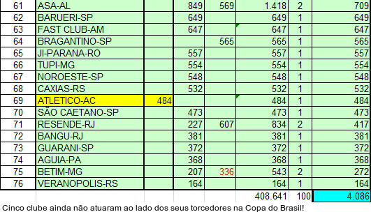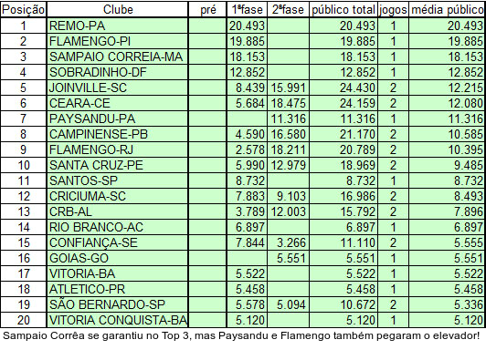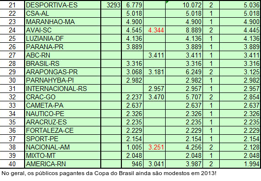 Atlético Goianiense, Coritiba, Cruzeiro, Figueirense e Ponte Preta ainda não atuaram ao lado dos seus torcedores. Em 100 partidas, a Copa do Brasil ostenta média de 4.086 pagantes e total de 408.641. Os números em vermelho ainda não foram confirmados pela Confederação Brasileira de Futebol (CBF).