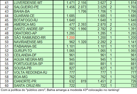 Por outro lado, a torcida do Bahia - insatisfeita com a baixa produtividade do time na temporada 2013 e, principalmente, com a falta de eleições diretas - lançou a campanha "público zero". Grande parte dos tricolores aderiu a proposta. Durante a eliminação para o Luverdense, o Bahia recebeu a presença de míseros 1.706 pagantes. Resultado: 43ª colocação para o Tricolor baiano.